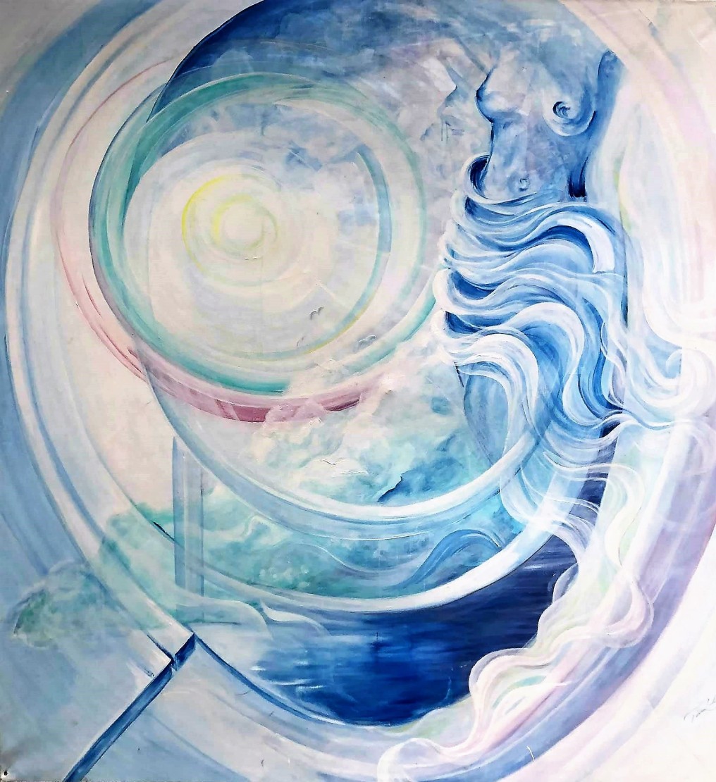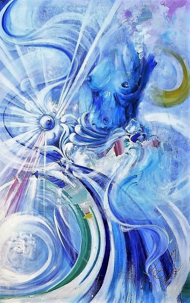 The blue of the female breasts conveys calm, harmony, deep relaxation and a sense of fulfillment. An ethereal work, therefore ”Reborn”, aimed at seeking a meeting point between dream and reality, of a higher, absolute, free reality. Artists such as Breton, Dali, Magritte, Miró, Ernst have embraced these precepts, expressed in all likelihood by the current of Surrealism. The latter, based on the exaltation of the unconscious and the subconscious within the creative process, according to which man is free to express the most authentic part of his being. Images, rather than words, are a privileged tool to best represent what happens in the dream, and so the surrealist artists, learned this teaching to create the basis of this new artistic current."