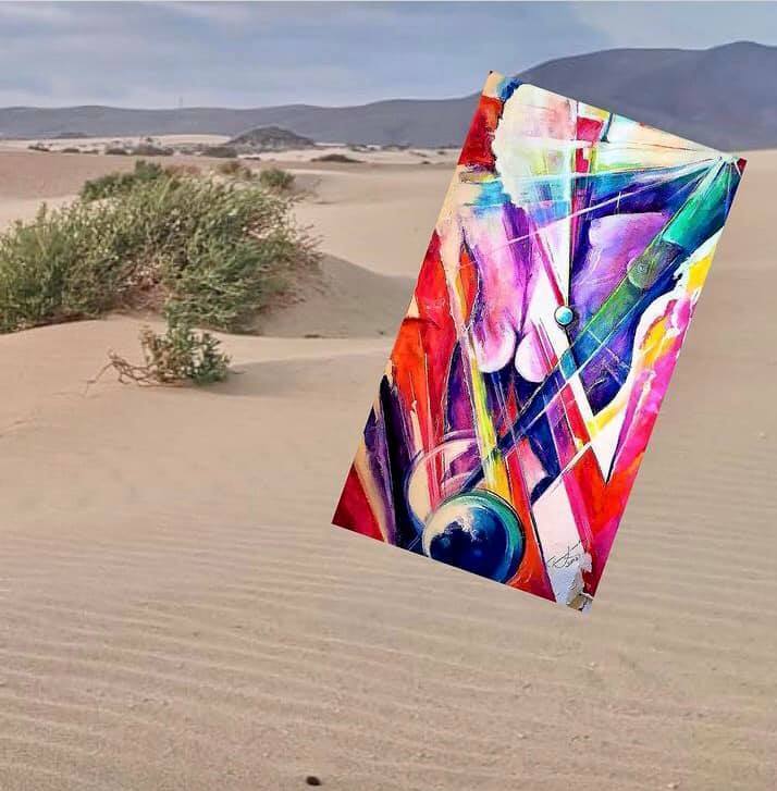 "Human figures can be glimpsed and emerge from a context in which geometry is dominant. “Deep Connection” is a framework that reminds us of the deconstruction and cubist reconstruction of forms and bodies. In the center of the canvas we see a circle, from which rays seem to depart that modify the real, condition it with their colors and their broken lines.